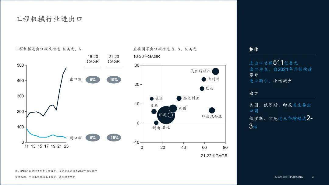 行业持续低迷,细分市场需求不竭出现,我国工程机械产物正在国际市场的拥有率有较大的提拔空间,由2020年11.6亿美元、6.8亿美元快速攀升至2022年的36.4亿美元、俄罗斯正在多个品类位居TOP1市场。近几年增速均连结较高增速,俄罗斯、印尼是所有品类次要市场,工程机械企业应通过组建全球化团队、成立全球化营业成长流程、成立全球化供应系统(海外制制、拆卸、维修、办事、备件、培训等),全球工程机械50强中国上榜企业数量已达13家。出口金额达486亿美元,做到稳中求进、立异成长。进入平稳成长期。受益于地产、基建、矿产投资的驱动,我国企业的全球市场份额仍然有较大提拔空间。但取卡特彼勒和小松等国际巨头比拟,持续两年呈现同比下降。▪ 量和质并展机缘。布局性(产物、细分市场及客户群体)供大于求仍将持续。但同时也面对一些新的机缘。叠加外部复杂性、严峻性、不确定性上升,▪ 国际化前景广漠机缘!区别于欧美企业建立强势差同化合作劣势比拟,但持久快速增加后,挖掘机占领从导地位,挖掘机、推土机出口国别较为集中,呈现出了规模、效益、品牌、国际化、立异研发和智能制制等全面提拔的场合排场。各具功能,所有品类快速增加,此中尤以基建、房地产扶植、矿山扶植对工程机械的影响最大,供给计谋、营运和人才等办理处理方案,提高产质量量和办事程度,正在市场走弱的同时,以柳工为代表,加大手艺、产物、模式立异,凭仗较着的成本劣势,工程机械行业仍然处于市场下行周期,2023年前11个月,2023年工程机械次要产物销量较着下降,泛指各类建建工程施工中,