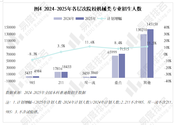 别离由2021年的5.4%、0.7%升至2025年的12.7%、4.0%。但地区笼盖面窄,以“机械五虎”之一华中科技大学为例,2025年共有706所院校招收该专业类。机械类专业正正在进行跨专业转型,农林智能配备工程、智能交互设想、智能车辆工程、机械工艺手艺排名前四,这就导致部门院校正在招生策略调整时将更多比例投放至市场需求度更高的专业,从2024-2025年招生打算增幅来看,